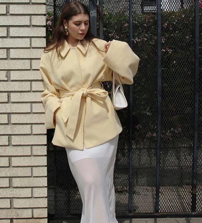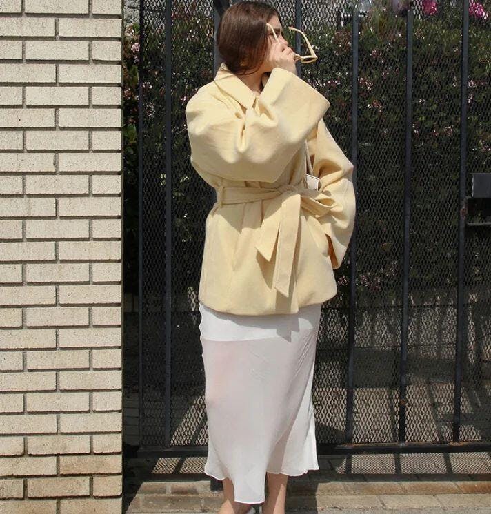 Like this cape - style coat! The fabric is thick and cozy, perfect for cooler days. The belt cinches the waist nicely, giving it a super chic silhouette. Paired it with jeans and a mini bag, and its an instant fashion win 🤩